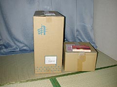 先週に引き続き、またまた金曜の夜8時、こんな格好でやってきました。ケースが入った箱とパーツが入った箱の2個。メモリはビッグカメラで128M/6千円でした。 |
