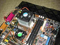 今度のケースは裏蓋がはずれないのでちょっとやりにくい。(前回と同じケースを注文したはずだったけど・・・。)ケースにつける前に、マザーボードにCPU、メモリをつける。マザーボードにもファンがついている。 |